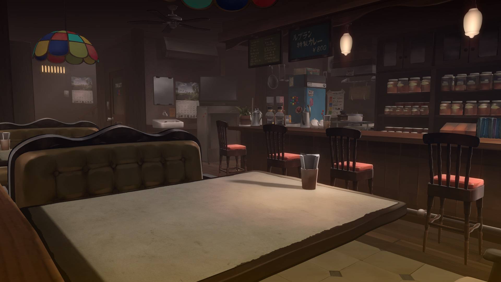 The inside is clean and cozy, with several conflicting menus on the wall above the counter. None of the lights work, but there's an odd mix of neon signs, classy lamps and plain hanging bulbs. Unlabelled bottles of what one can only assume is alcohol cover the shelves behind the counter, alongside jars of coffee beans and tea leaves. A jukebox, pinball machine and dartboard can also be found in the corner next to the bar, though only the dartboard is playable right now.